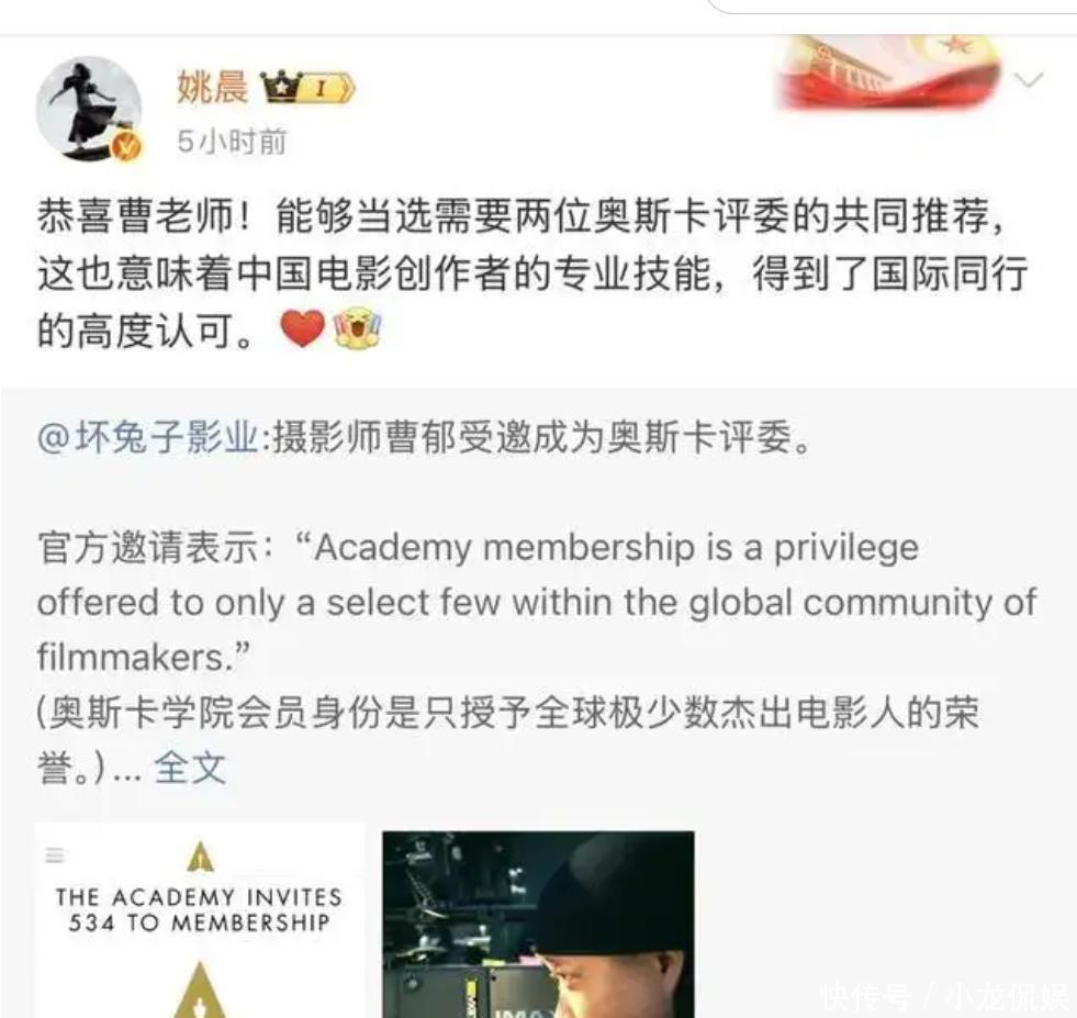 2025年曹郁当选奥斯卡评委,姚晨发微博祝贺,称呼变成了“曹老师”。这个称呼,客气得像在称呼一个同事。