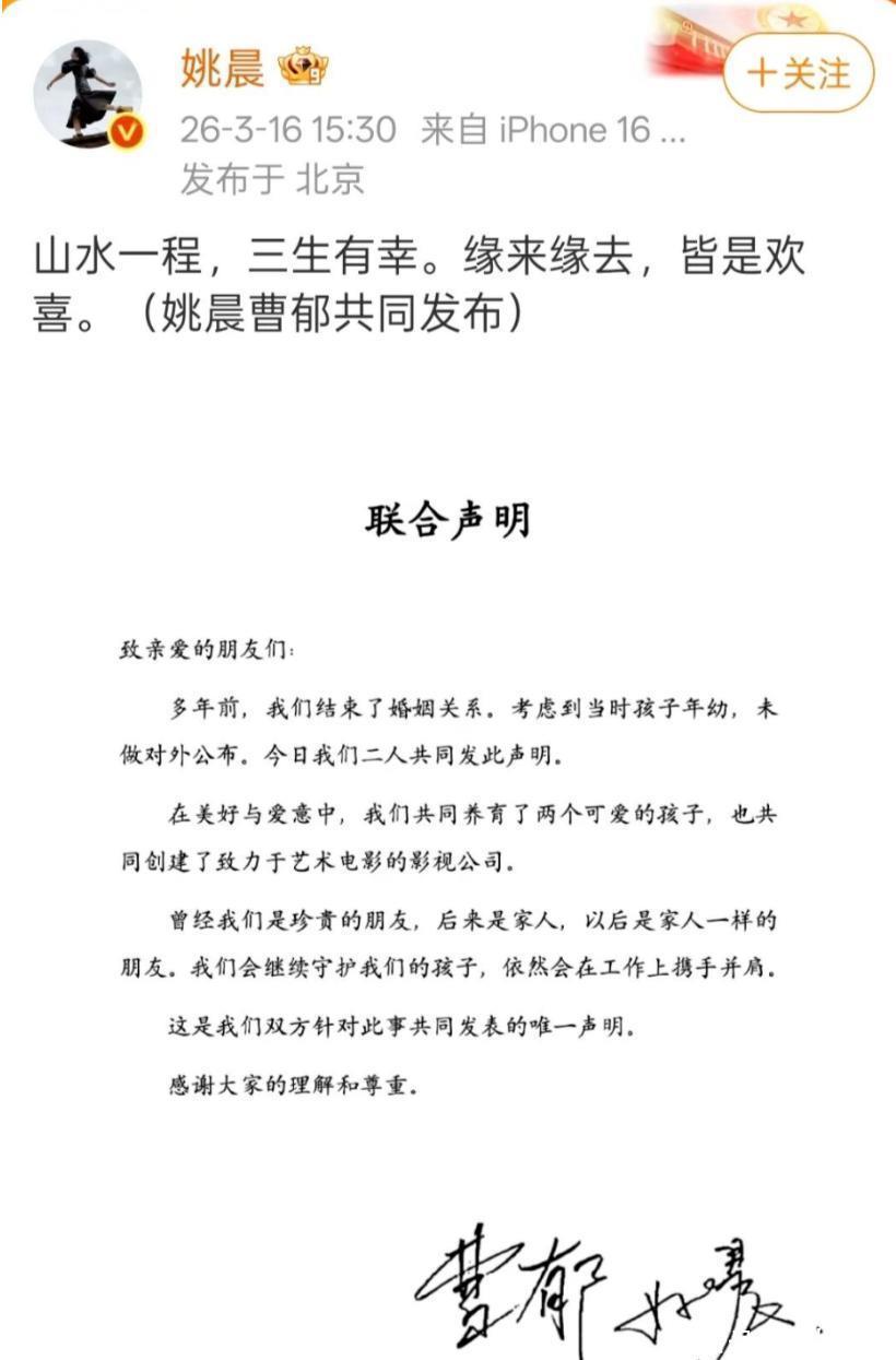 声明是两个人一起发的。措辞很轻,很淡:“山水一程,三生有幸。缘来缘去,皆是欢喜。”